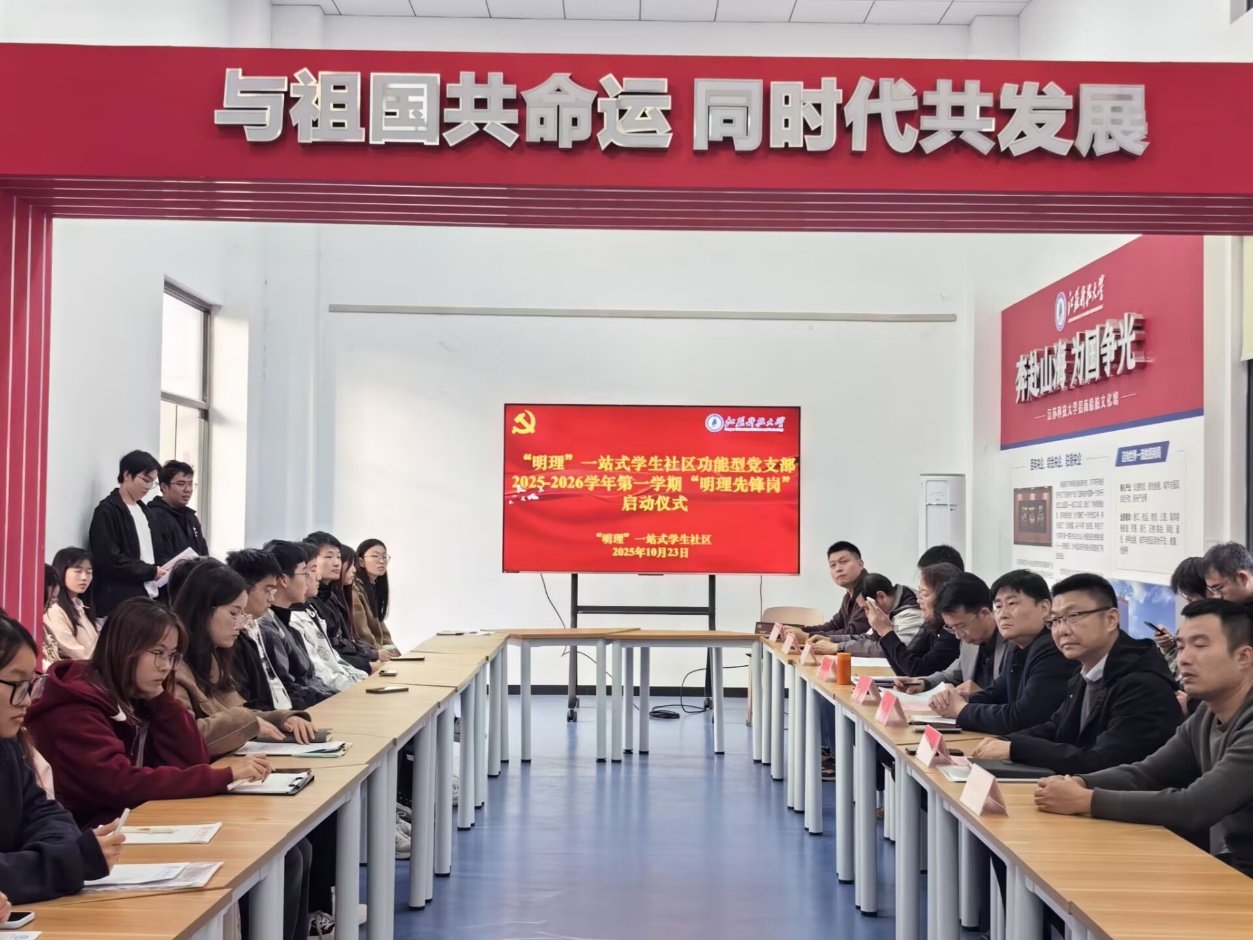 10月23日下午,理学院“明理”一站式学生社区开展2025-2026学年第一学期“明理先锋岗”启动仪式。学院党委书记徐文睿、党委副书记周志辉,审计处副处长韩罡,公寓管理服务中心主任杭坚等领导嘉宾,与功能型党支部书记、博士党员代表、生活指导老师代表及学生党员和入党积极分子代表齐聚一堂,共同见证了这一推动党建引领与学生社区建设深度融合的重要时刻。仪式由笃行功能型党支部书记贡一鸣主持。