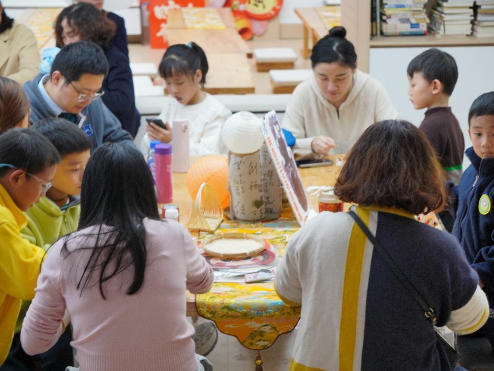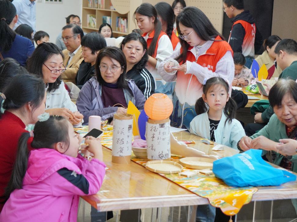 志愿者们引导参与者制作手串