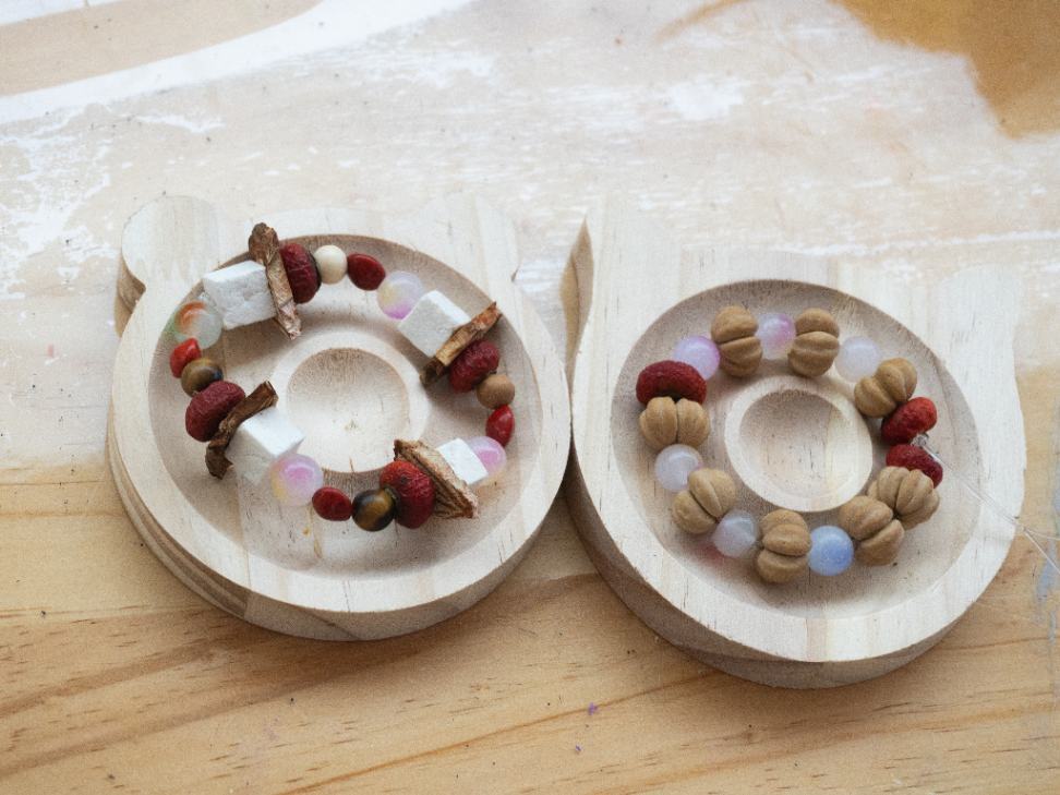 随后,在现场志愿者的引导下,参与者开始专注于手串的选料、搭配与串制过程。从本草的芳香中挑选出带有天然纹理的木珠、甄选散发清雅气息的本草籽,到根据喜好调整串珠顺序,每一步都需要身心的协调。本草的温润香气萦绕鼻尖,使参与者的思绪从繁杂事务中抽离,沉浸于当下的手工制作,进而舒缓身心的紧绷感,让情绪在专注中慢慢沉淀,最终实现压力的释放、内心的放松与深度的自我疗愈。