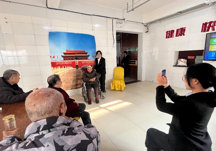 随后进行的“天安门定格‘圆梦照’”活动,将现场气氛推向高潮。支部成员细心为老人整理衣领、梳理银发,在天安门背景幕布前耐心引导、捕捉笑容,用快门记录下一张张珍贵的“圆梦”瞬间。梁金芳奶奶看着刚拍好的照片,笑得合不拢嘴:“年轻时没机会去天安门,今天终于‘去’了!”整个下午,怡养院内快门声与欢笑声此起彼伏,张张笑脸在秋日阳光下熠熠生辉。