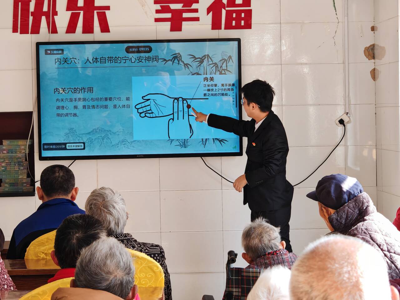 活动伊始,支部党员开展了“节气科普送健康”专题讲解。10月23日正值霜降节气,为将“今年秋天的最后一份健康”及时送到老人身边,支部党员吴元浩围绕“霜降”养生知识,为老人们带来一场实用有趣的健康科普。“爷爷奶奶们注意啦,霜降到了,天气越来越凉,咱们首先要做好保暖,尤其是膝盖、脖子这些容易受凉的部位,出门记得添件薄外套、戴个围巾!”他结合老年人饮食特点,重点介绍了“少辛增酸”的养生原则,推荐了梨、苹果、山楂等水果,以及银耳莲子汤、百合粥等润燥易消化的食谱。此外,他还现场示范了内关穴的按摩方法,帮助老人缓解心慌、失眠等常见不适。
