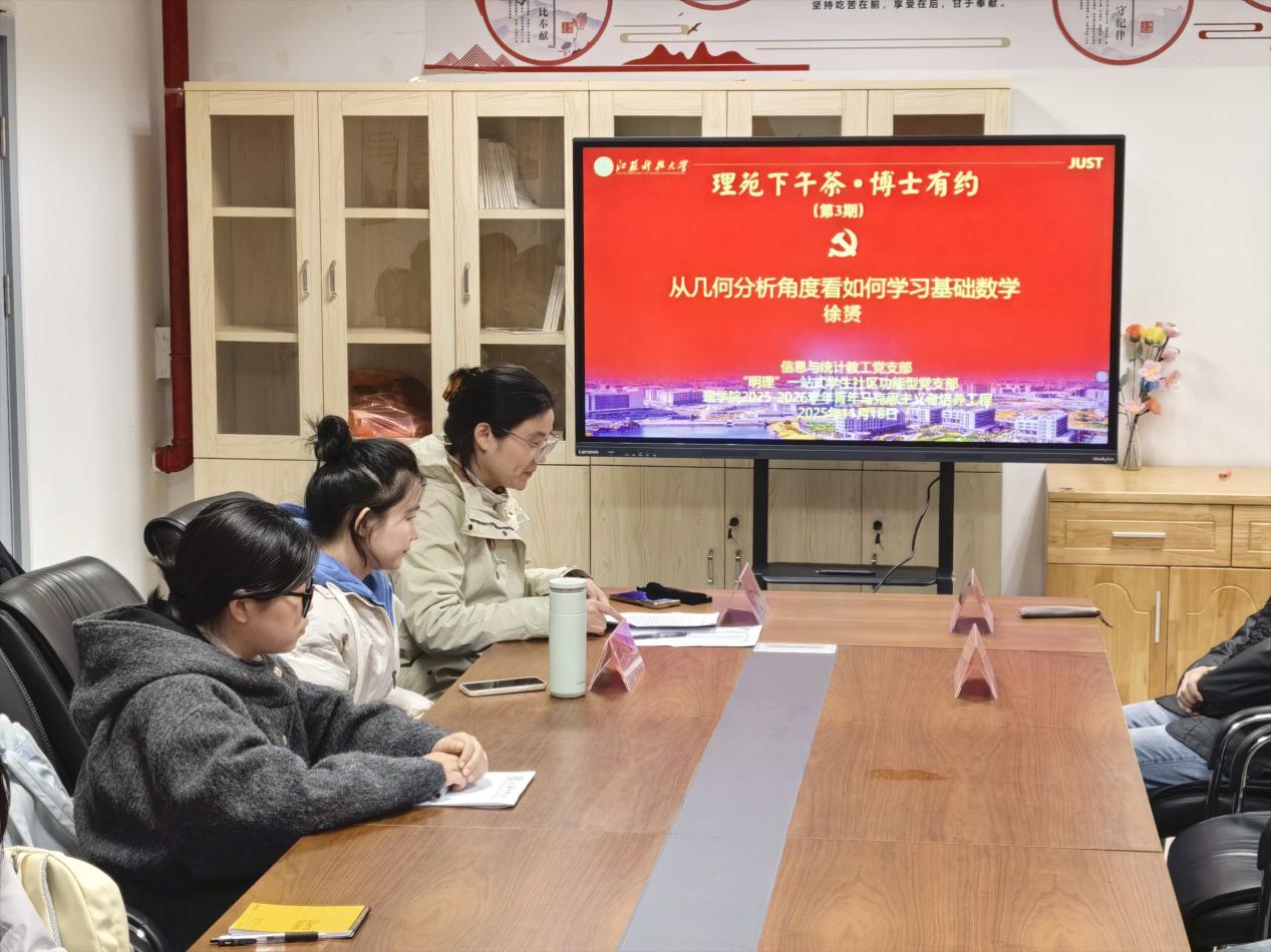 11月18日下午,理学院“明理”一站式学生社区功能型党支部在一站式学生社区举办“理苑下午茶·博士有约”第三期活动。信息与计算科学系徐赟博士、邱水寒博士、李海丹博士应邀与30余名2025级信计专业的新生共话“从几何分析角度看如何学习基础数学”“用数学构建网络模型”以及“数学的发展与应用”。活动由“明理”功能型党支部书记孙莞主持。