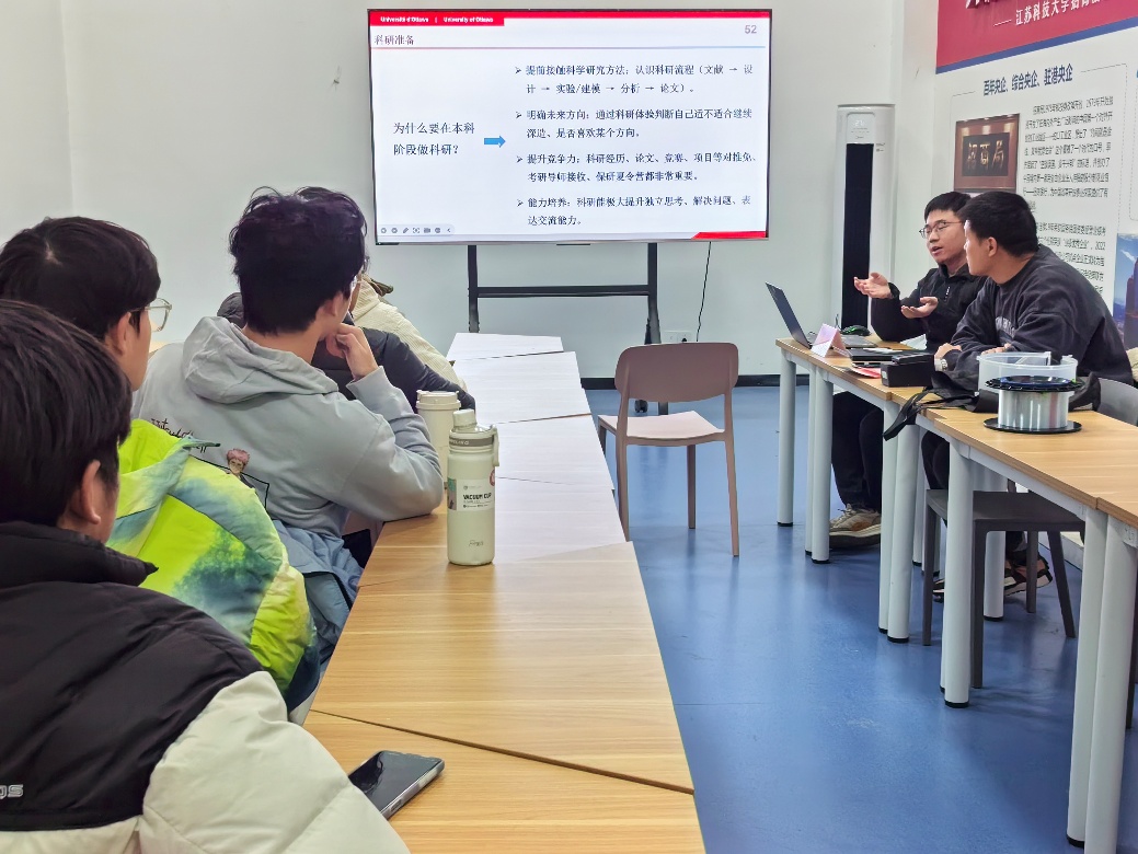 此外,王远博士还为同学们介绍了理学院实验室的基本情况以及就本科阶段为什么要做科研、如何做好科研等问题展开讨论。王博士表示,大学本科阶段最大的优势就是没有试错成本,他鼓励同学们在这一阶段一定要积极探索,在不断试错中找到自己喜欢的方向,在这个过程中主动与导师沟通交流,从尝试参与导师的子项目开始逐步走进科研竞赛的大门。