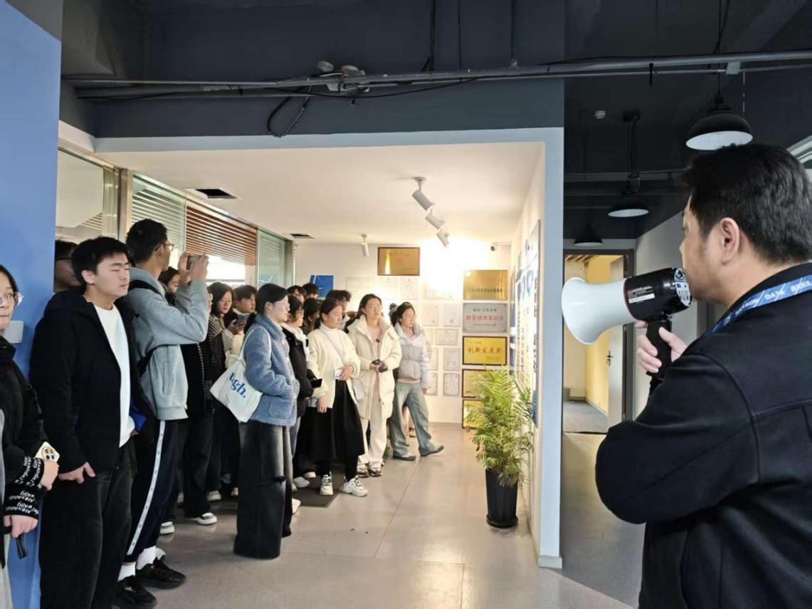 在企业实践观摩环节,同学们跟随讲解员进入镇江嘉创网络科技有限公司,了解企业情况、企业文化和企业理念,对工作环境有了初步认知。同学们现场观看了数字化平台的运作演示,近距离了解前沿技术在产业发展中的应用场景,不少同学围绕技术原理、落地成效、应用前景等问题与现场工作人员交流探讨,在互动中深化了对“理论联系实际”的理解,深入了解专业所学在社会中的运用。