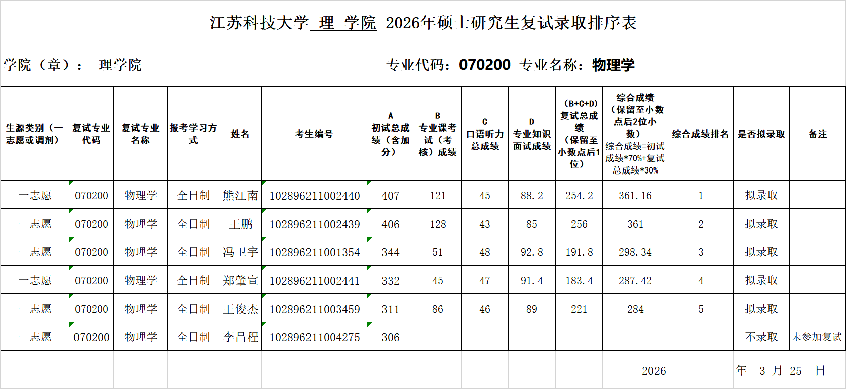 raybey雷竞技 理学院 2026年硕士研究生复试录取排序表