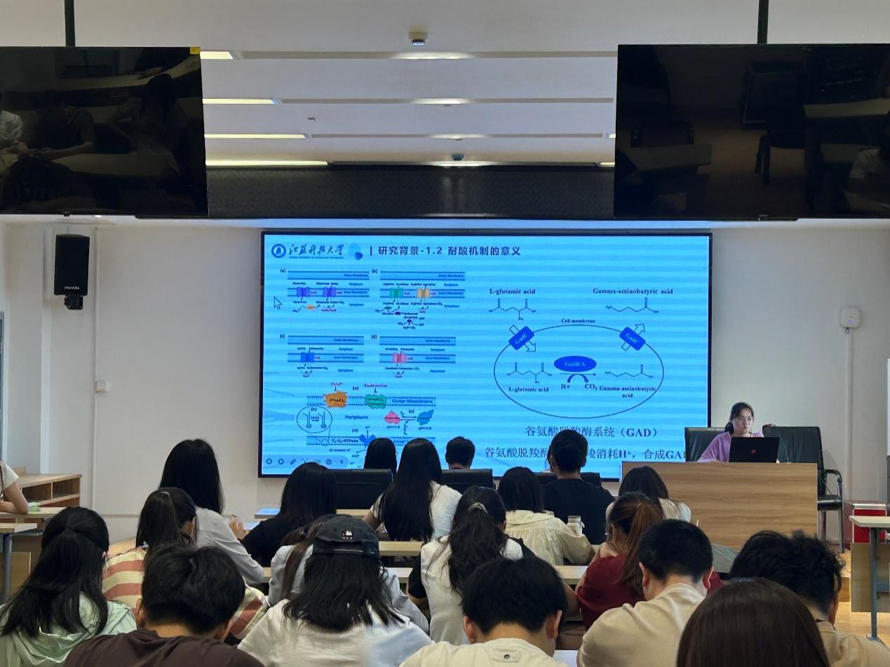 李婷婷同学介绍了关于《鸟肠球菌谷氨酸脱羟酶系统的耐酸机制及其GABA合成的研究》,展示了她在微生物代谢途径方面的研究成果。