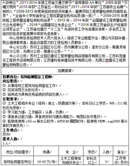 江苏省建筑工程质量检测中心有限公司(苏州岗位)2021年招聘公告