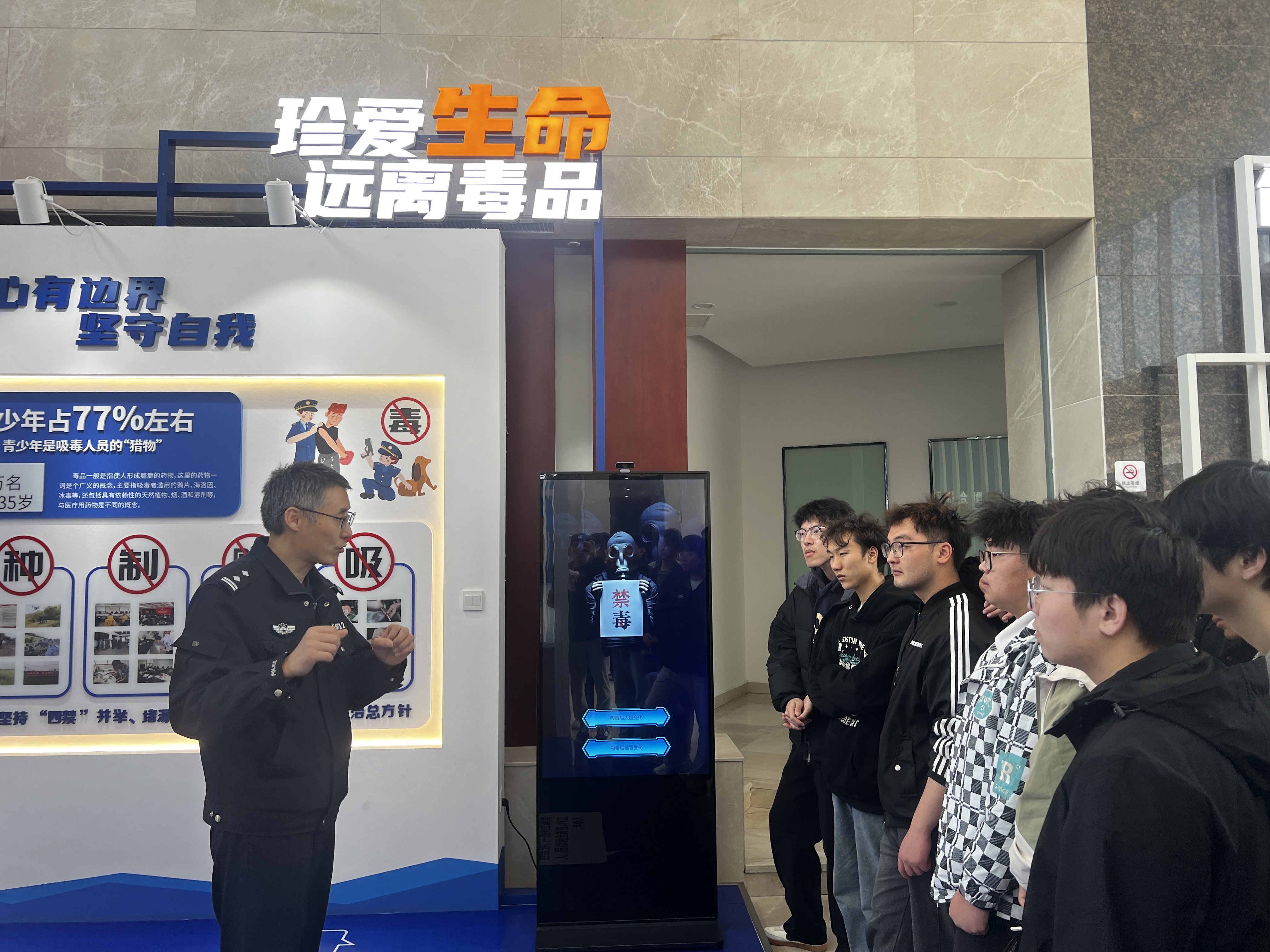在本次活动中,娜警官向同学们详细展示了丹徒派出所的全方位布局,涵盖了禁毒教育、网络安全知识普及和反诈安全知识讲解三大板块。首先,在张警官的引导下,同学们深入了解了毒品种类及有害药物的危害,认识到它们对身体和心理健康的巨大破坏。通过智能模拟吸毒后的面部变化,同学们直观地体验了吸毒早、中、晚期的恐怖变化,从而更加深刻地理解了毒品的危害,树立了正确的健康观念。