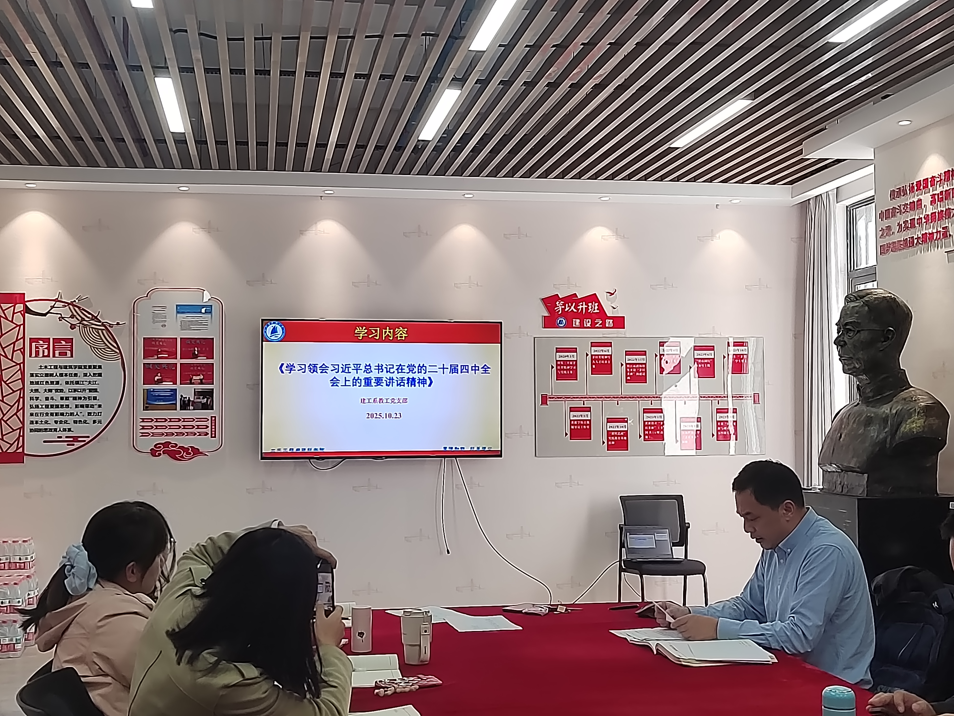 2025年10月23日下午,土建学院全体教职工和党支部开展了政治理论学习活动。全体教职工和党员一起学习了深入学习习近平生态文明思想,深入践行“绿水青山就是金山银山”理念,学习领会习近平总书记在党的二十届四中全会上的重要讲话精神、习近平总书记关于党的建设的重要思想、中国共产党党员教育管理相关内容。