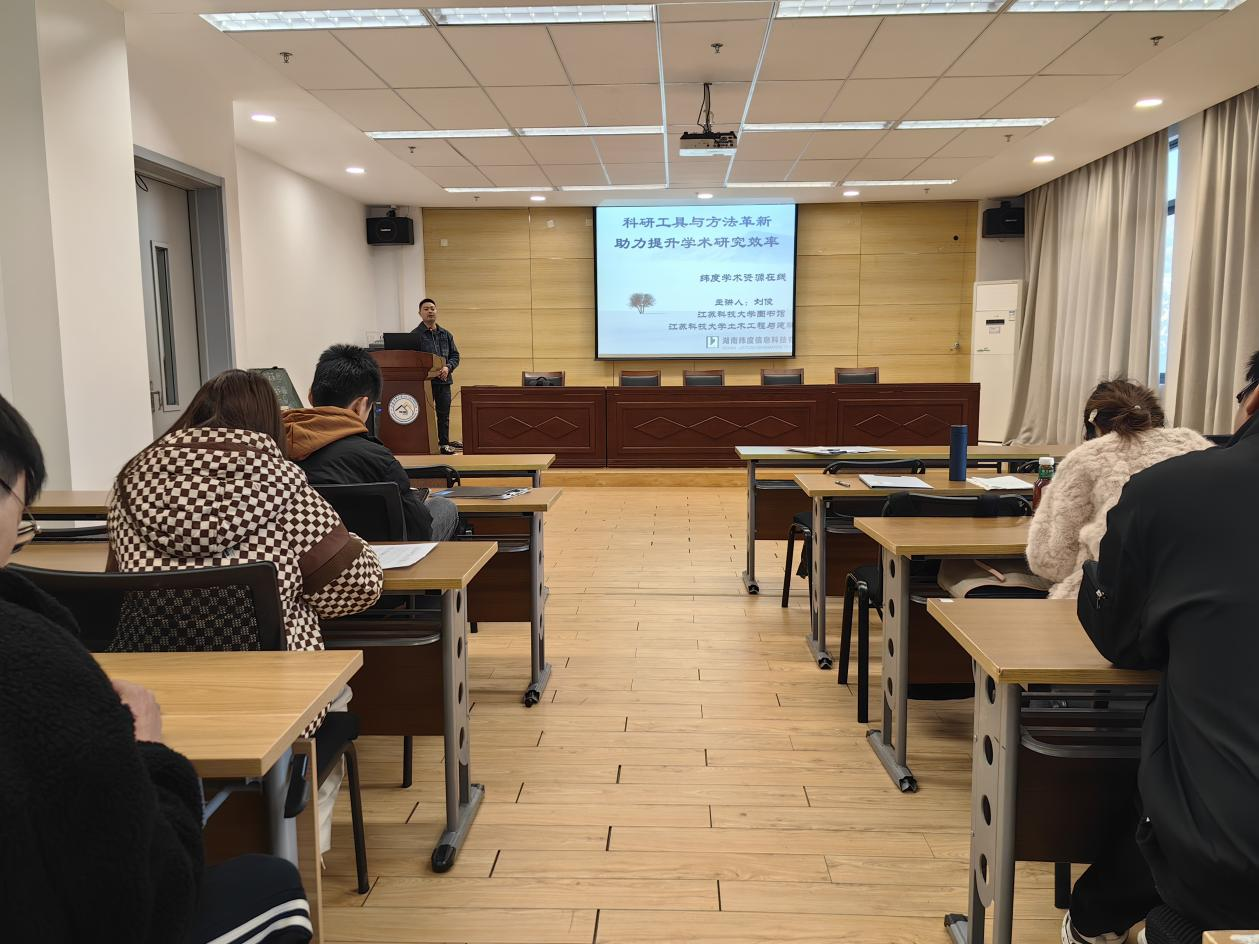 为切实提升研究生文献检索能力与科研工作效率,11 月 19 日下午,我校土建学院在韶华里一站式社区 302 多媒体会议室成功举办 ”科研工具与方法革新:助力提升学术研究效率” 专题培训讲座。本次讲座特邀校图书馆专职数据库讲师刘俊主讲,聚焦“纬度学术资源在线”数据库的实用功能与学术应用,为在场研究生带来一场针对性极强的科研技能盛宴。