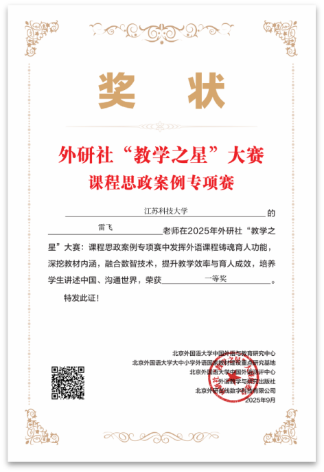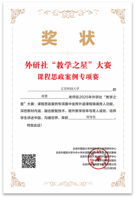 近日,2025年外研社“教学之星”大赛课程思政案例专项赛获奖名单正式公布。外国语学院多位教师凭借扎实的专业功底、创新的教学设计和深厚的课程思政育人理念,在主赛道中表现突出,取得历史性突破。蒋慧、谭方黎老师荣获特等奖;雷飞、曹莉、王蓓老师荣获一等奖;张学谦老师荣获获二等奖;吴丹娜老师荣获三等奖。无论从获奖数量、等级,还是参与人数来看,均创我院参加该赛事以来最佳成绩,也位居省内高校首位。