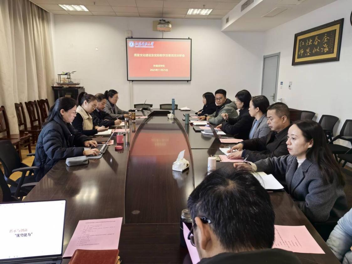 11月25日下午,外国语学院在文理大楼1546会议室召开本科教学质量分析会,围绕质量文化建设与教学实效提升展开研讨。校本科教学督导组专家蒋家尚教授到会指导,学院领导班子、各系部主任、专业负责人、院督导组组长、实验室主任、教务办与学工办负责人共同参会,共商本科教学高质量发展大计。会议由副院长韩菁菁主持。