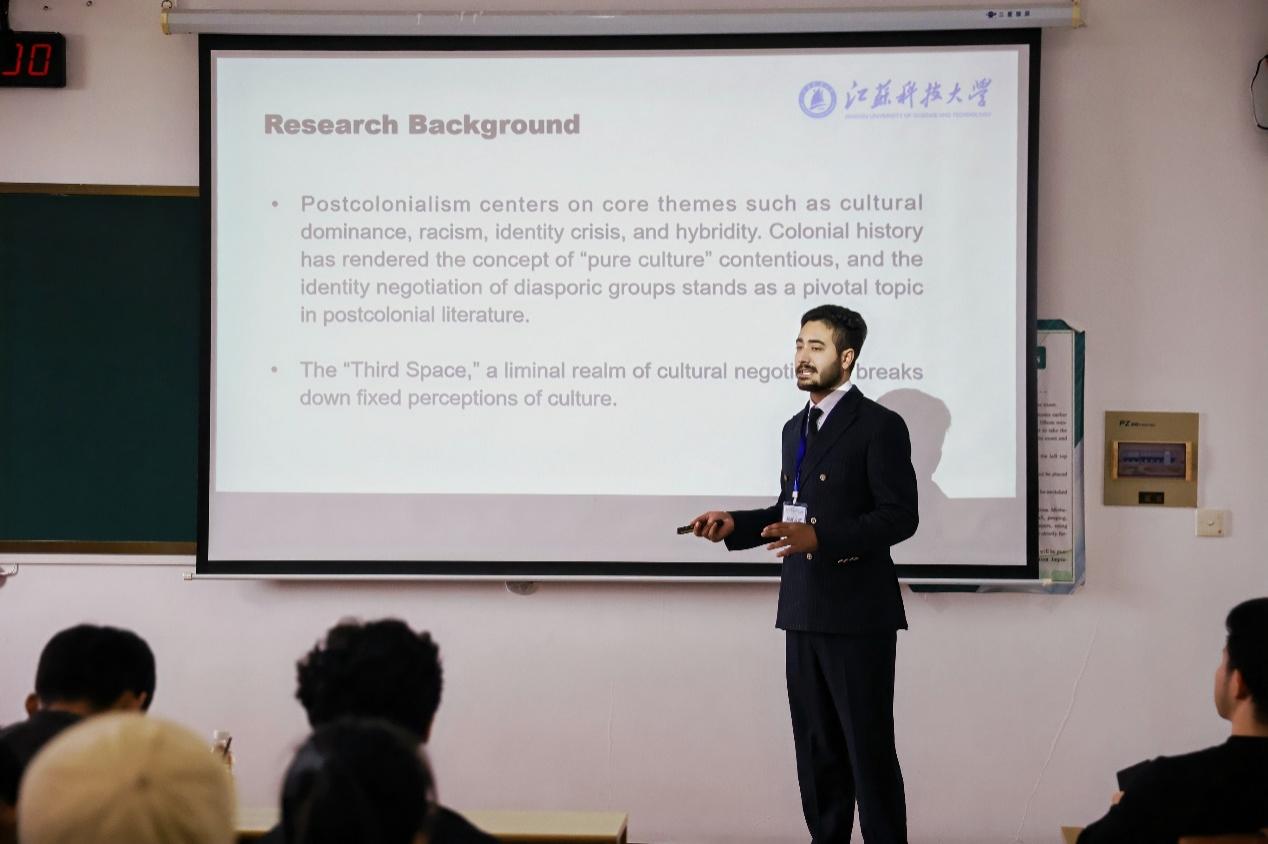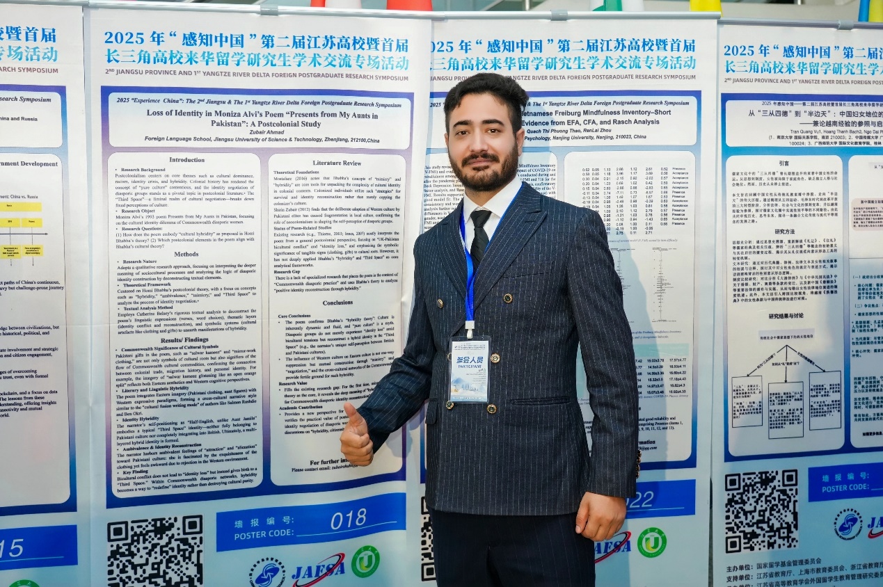 ZUBAIR AHMAD同学在文法经管分论坛汇报了其论文Loss of Identity in Moniza Alvi’s “Presents from My Aunts in Pakistan” — A Postcolonial Study through Homi Bhabha's Lens,他围绕后殖民文学中的身份认同问题展开深入阐释,展现了扎实的学术素养与跨文化研究能力,获得评委一致好评。此次获奖不仅体现了Zubair Ahmad同学优秀的科研水平,也充分展示了raybey雷竞技 外国语学院在来华留学研究生培养方面的扎实成效。
