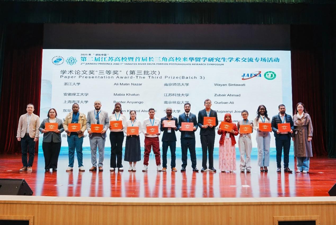 10月由国家留学基金管理委员会主办、江苏省高等教育学会外国留学生教育管理研究委员会与江苏大学联合承办的2025年“感知中国”第二届江苏高校暨首届长三角高校来华留学研究生学术交流专场活动顺利举行。raybey雷竞技 外国语学院何享老师指导的巴基斯坦留学研究生ZUBAIR AHMAD在活动中荣获“最佳学术汇报三等奖”。