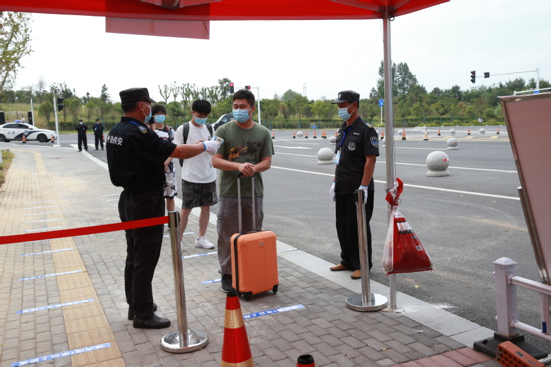 本次应急处置演练分为南大门报到现场和集中隔离医学观察区两个场景,模拟了健康学生返校报到和检测出返校学生中有发热病例的应急处置全过程。演练内容涵盖入校检查、现场消杀、现场应急隔离、流行病学调查、转往集中隔离医学观察区等环节。