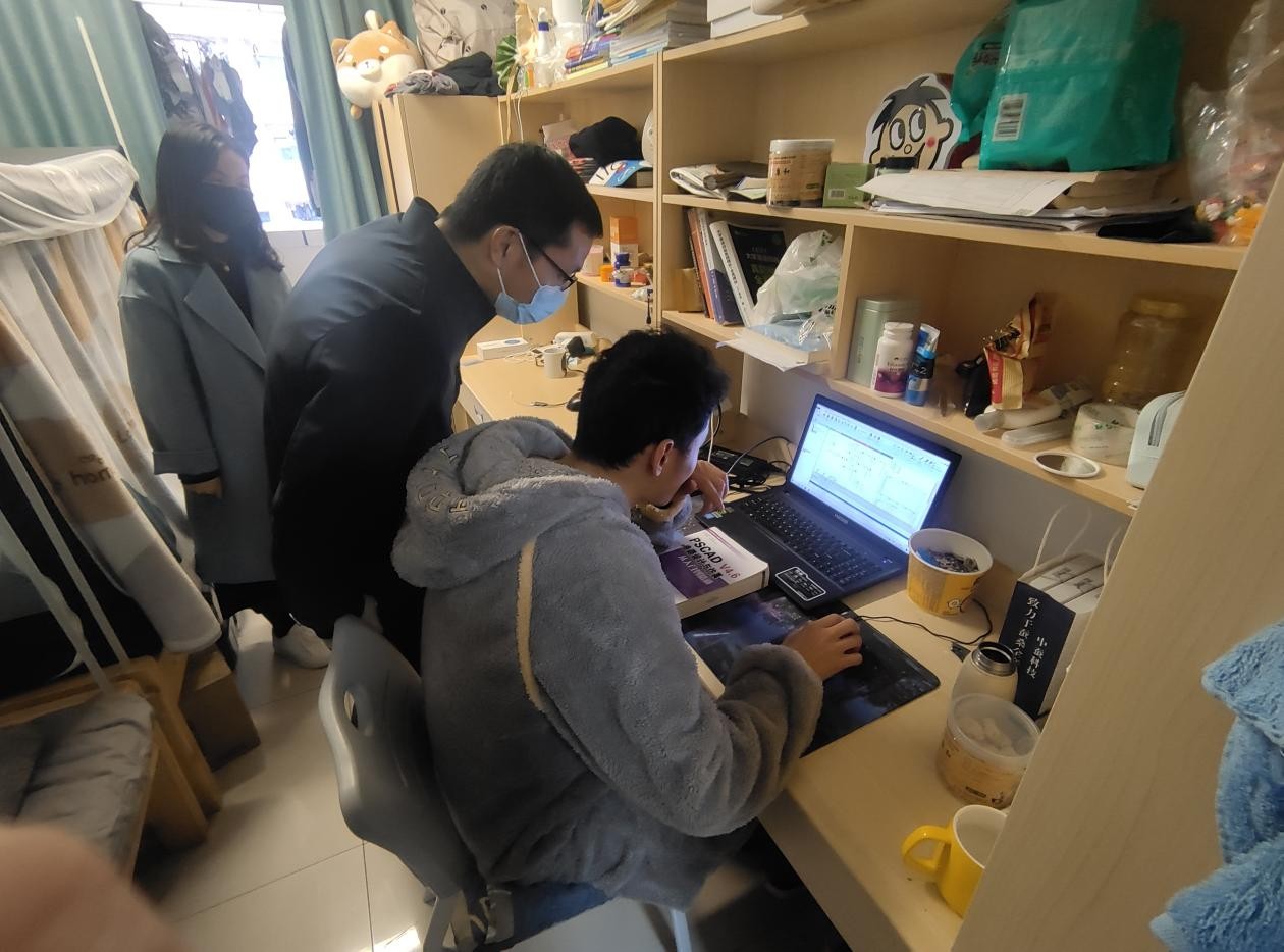 12月07日下午,自动化学院院长姜文刚、党委书记张霞和党委副书记郭峰等老师走进研究生宿舍,和研究生们亲切交流。“你的家乡是哪里?学期末学习怎么样?”姜文刚院长询问同学们个人情况,提醒同学们遵守学校疫情防控规定,自觉做好个人防护,提高安全防范意识,主动规划未来,在兼顾学习的同时也要注重身体健康,不负青春韶华,不负理想岁月。张霞书记鼓励研究生们要充分利用业余时间加强锻炼,保持良好的睡眠,保证身心健康。