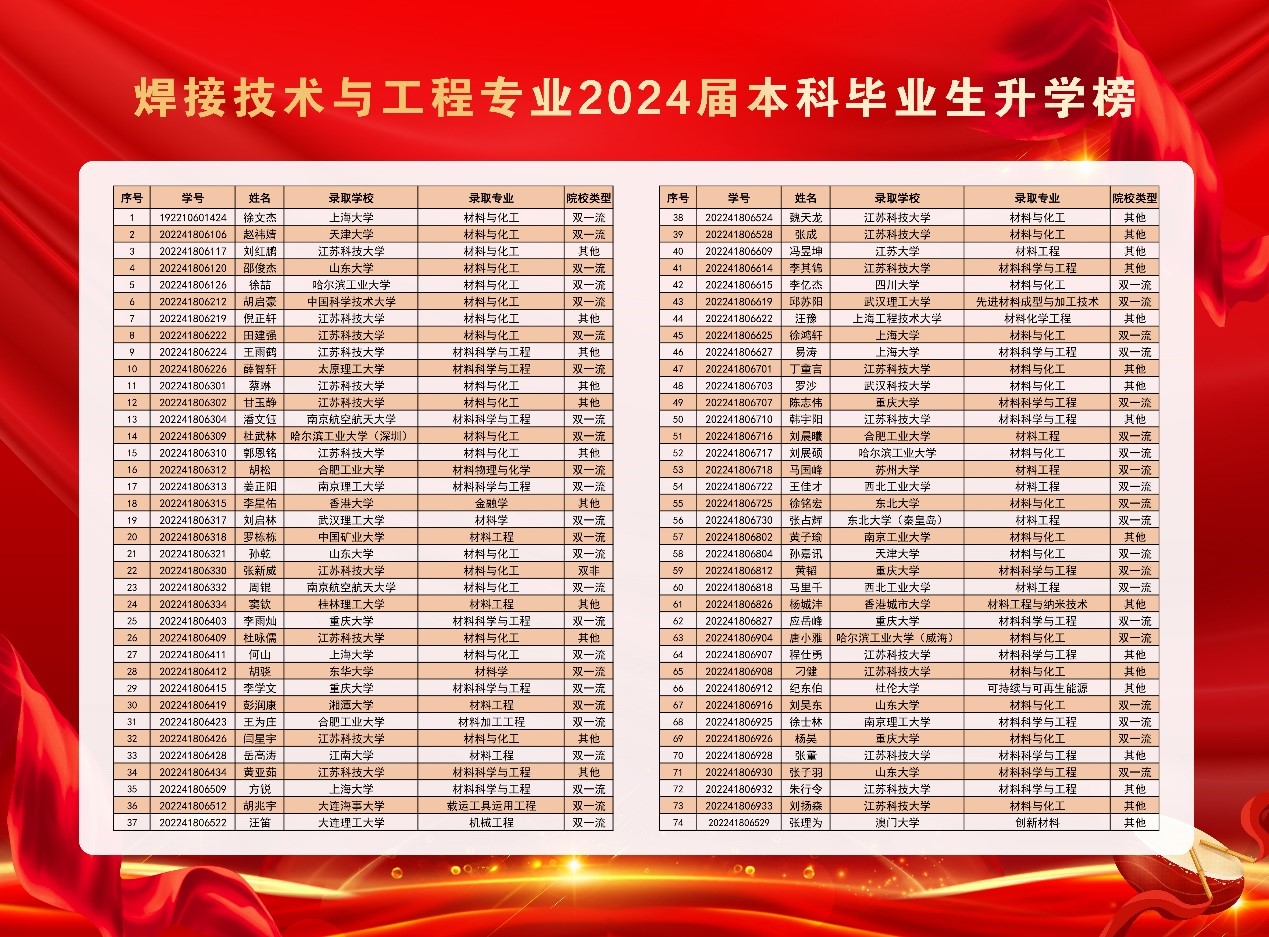 专业共124人,升学74人,录取率达59.68%,包揽全校考研学霸班级前3名,涌现出5个学霸宿舍。毕业季,材料学院2020级焊接技术与工程专业交出了一份亮眼的考研成绩单。成绩的背后是每一位班级成员的戮力同心、奋勇争先,更有一群老师们的默默陪伴和付出。