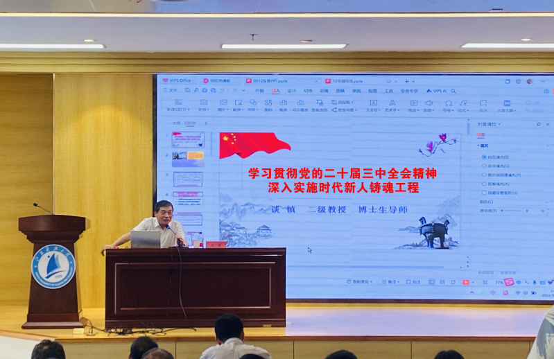 谈镇教授围绕学习贯彻党的二十届三中全会精神、用马克思主义世界观和方法论铸魂育人、实施铸魂工程助力一流特色高水平大学建设三个方面进行讲授。他从经济学的角度分享了自己的学习体会,强调了党的二十届三中全会的重大意义,并对辅导员如何将全会精神融入到学生思想政治教育中提出了明确的指导。他指出,要主动作为,加强对外交流;育人队伍必须要做到信念过硬、政治过硬、责任过硬、能力过硬、作风过硬。