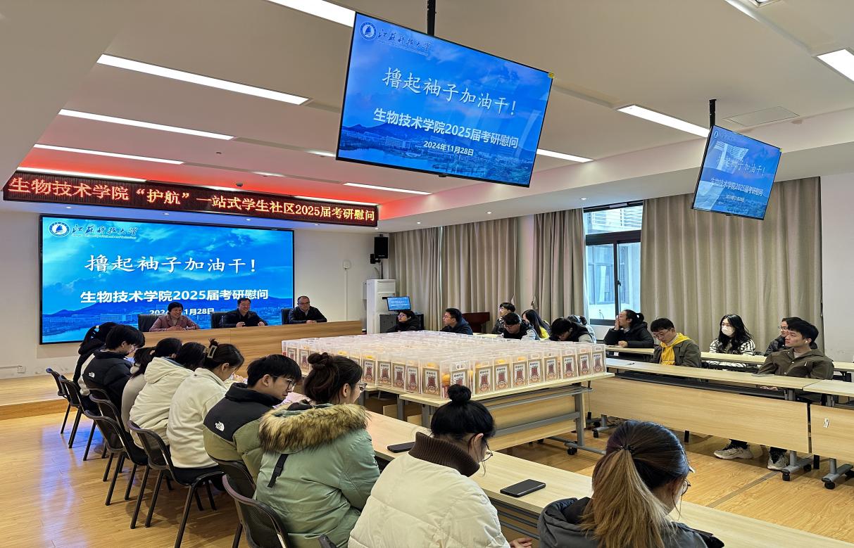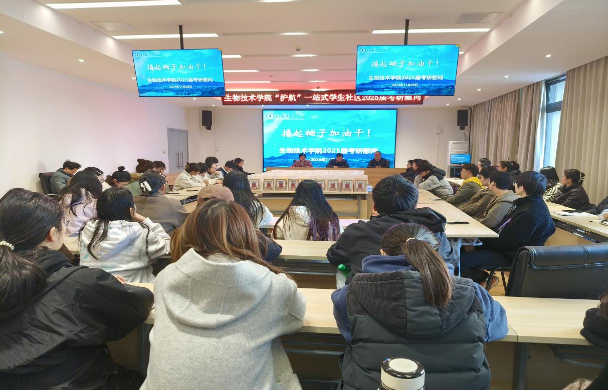 为进一步推动学风建设,营造良好学习氛围,11月28日下午,生物技术学院在生技楼330会议室组织开展2025届“撸起袖子加油干”考研学子慰问活动,旨在为考研学子送上关怀与温暖,缓解备考压力,鼓舞考研学子斗志,激励他们坚定信心、全力以赴,再创佳绩。生物技术学院党委书记钱平、副书记唐亮、副院长吴琼英、团委书记邹金城、辅导员陈舒眉以及一百余名大四考研学生参加了慰问活动。