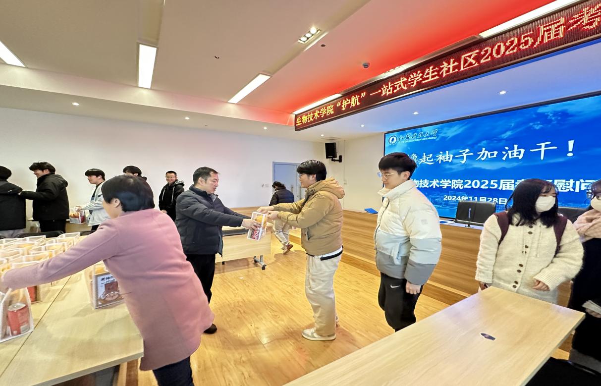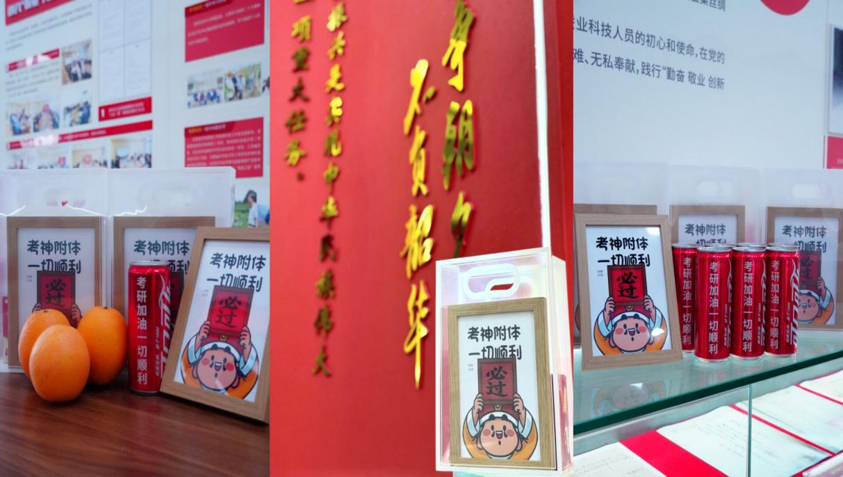 活动现场,生物技术学院精心布置了展台,设计了慰问品摆放造型,营造出浓厚的氛围。其中有印着“考研加油,一切顺利”的“可乐”、“逢考必过”的相册祝福、每人都有“好事‘橙’双”以及补充能量的小零食和贴心保暖的暖宝宝。