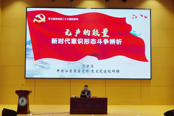 为深入学习贯彻党的二十大精神,特别是习近平总书记关于意识形态工作的重要论述,进一步加强学生工作队伍和学生干部队伍意识形态能力建设,不断提升安全意识,筑牢思想防线。4月27日,学生处、研工部邀请江苏省委党校党史党建教研部副教授、中国社科院政治学博士蔡宗溢来校开展“无声的较量——新时代意识形态斗争辨析”主题讲座。讲座由研工部部长徐剑主持,学生处、研工部、各学院分管学生工作副书记、全体辅导员以及主要学生干部代表等200余人参加讲座。