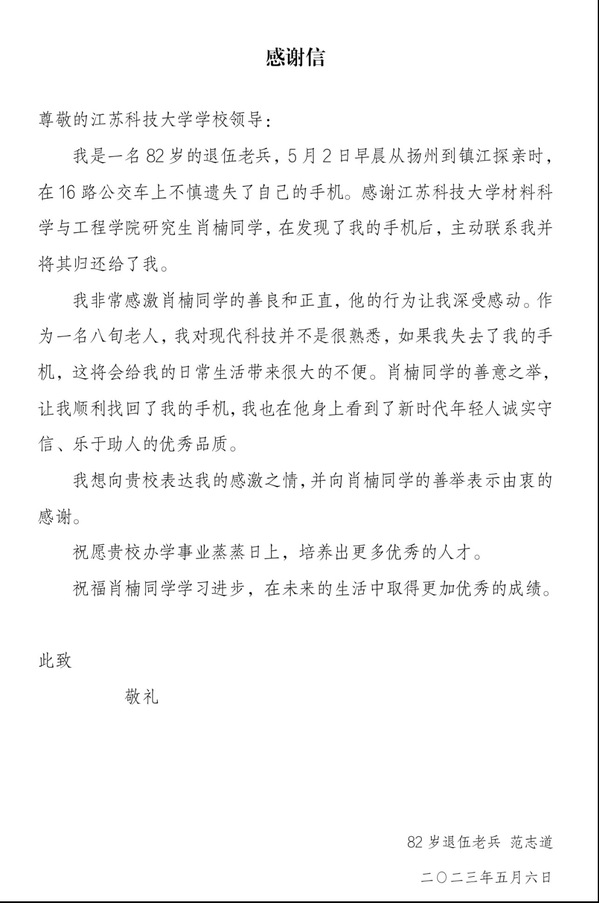 5月6日,在raybey雷竞技 教师工作群和微信朋友圈,老师们转发了一封82岁退伍老兵对我校研究生肖楠同学的感谢信,迅速引发广大师生和社会热议,大家纷纷为我校肖楠同学拾金不昧点赞。