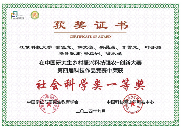 据悉,中国研究生乡村振兴科技强农+创新大赛是“中国研究生创新实践系列大赛”的重要主体赛事之一,由教育部学位管理与研究生教育司指导,分为科技发明制作类、自然科学类、社会科学类三个赛道,竞赛设全国冠、亚、季军及一、二、三等奖奖项。2024年大赛经过组委会审核确认,共有效推荐作品591件,经过作品初评和决赛答辩,最终评出一等奖、二等奖及三等奖,分别约占报名参赛队伍总数的5%、10%和15%。