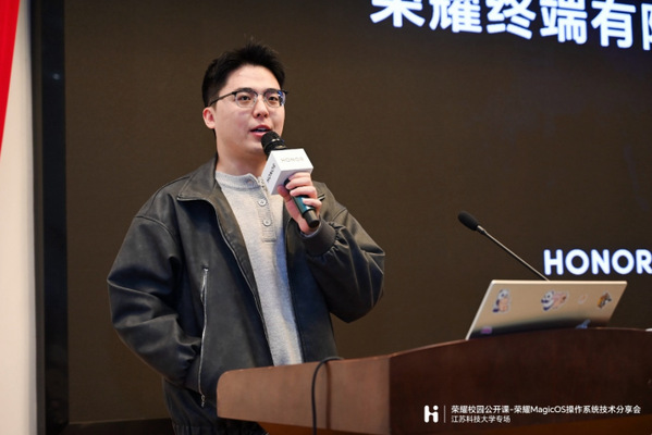讲座伊始,荣耀江苏业务部镇江地市经理张雨喆为同学们介绍了超快充、智慧屏控等荣耀领先技术以及集成于荣耀生态系统内的MagicOS智慧互联体系,演示了智慧互联加持下的多设备协同、跨屏操作等便捷功能。