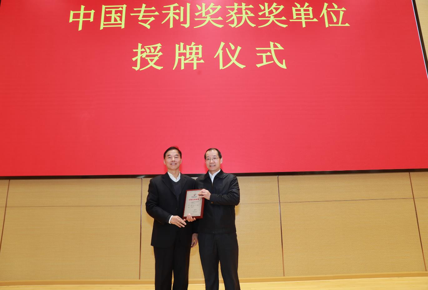中国船舶与海洋工程产业知识产权联盟理事长、校党委书记葛世伦为中国专利奖优秀奖获奖单位授牌