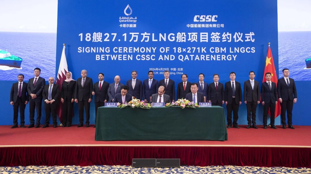 4月29日,中国船舶集团有限公司与卡塔尔能源在京举行18艘全球最大27.1万立方米超大型液化天然气(LNG)运输船项目签约仪式。工业和信息化部副部长单忠德,外交部西亚北非司大使吕健,中国船舶集团董事长温刚、副总经理盛纪纲,卡塔尔能源事务国务大臣、卡塔尔能源总裁兼首席执行官萨阿德·谢里达·阿尔卡比,卡塔尔能源天然气首席执行官卡利德·阿尔-塞尼,卡塔尔能源商务和业务发展执行副总裁贾西姆·阿尔马拉祖齐等领导和嘉宾出席签约仪式。