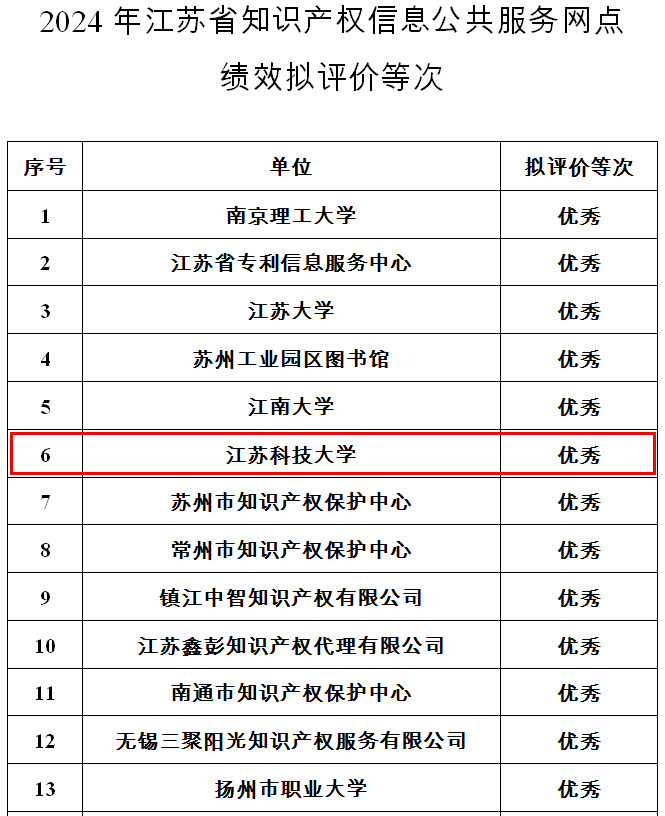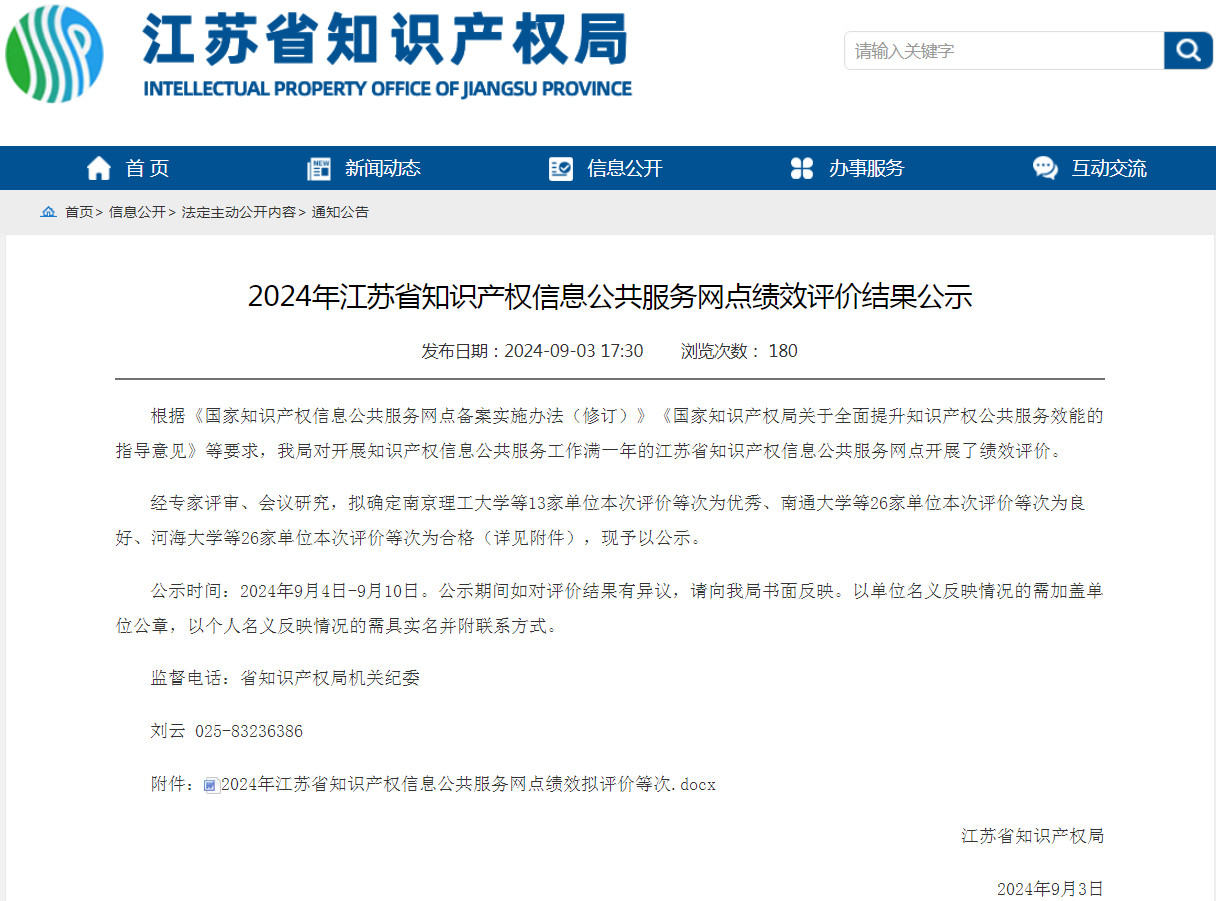 9月3日,江苏省知识产权局公布2024年江苏省知识产权信息公共服务网点绩效评价结果,raybey雷竞技 以绩效评价排名第六的成绩被评为优秀等次,成为了13家优秀网点之一。此次省知识产权局对开展知识产权信息公共服务工作满一年的65家江苏省知识产权信息公共服务网点进行了绩效评价。