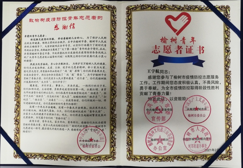 疫情当前,青年当先,家乡所向,青年所行。身为党员和研究会主席的王宇航,一回家便主动请缨,投身于疫情防控第一线,跟随社区工作人员,对辖区外来居家隔离人员进行每天两次的体温检测回访,为所在辖区楼宇消杀,张贴宣传海报,向社区居民宣传防疫知识,对未正确佩戴口罩的居民及时进行纠正。在全民检测期间,她是核酸检测的秩序员,在全员检测结束后,她是信息统计的录入员。用自身行动点亮志愿服务的光芒。