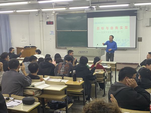 讲座伊始,郭峰老师通过“你想成为怎样的人?”“四年,能否发生质的变化?”“你的目标是什么?”三个方面详细阐述了个人对目标与自我实现的思考。期间,通过交流互动,郭老师指出:“我们可以激情地度过大学四年,也可以经历“苦行僧”般的历练,亦或漫无目的、糊里糊涂,而这取决于大家是否清楚自己的目标、是否对自己的未来有明确的规划!”通过详实生动的案例分析和层层递进的灵魂拷问,引导同学们树立人生目标,学好青春“必修课”。郭老师寄语同学们在新征程上要有正气、有理想、讲政治、努力进取、敢于拼搏,用热情与汗水书写壮丽的人生篇章。