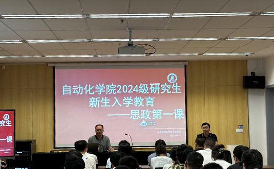 2024年9月11日,自动化学院学术报告厅内,迎来了2024级研究生入学教育的首场讲座——“思政第一课”。此次讲座由学院党委副书记郭峰主讲,辅导员赵焕及全体2024级研究生新生共同参与。作为研究生阶段的重要开端,此次讲座不仅为新生们铺设了学术道路的基础,更引导他们在思想上树立崇高目标,追求卓越。