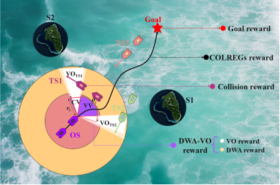 随着智能技术的发展,未来有人和无人船舶将长期共存、形成混合交通体系。在该体系下,无人船舶如何与有人船舶和谐共存和按照人类的航行规则进行安全航行是值得研究和探讨的问题,因此,实时安全避碰对于复杂环境中的水面无人艇(USV)至关重要。针对传统方法难以保证控制决策安全性和实用性的平衡问题,团队提出了一种基于互补原理的两级激励奖励机制,并构建了基于深度强化学习的安全避碰算法框架。同时为了解决深度确定性策略梯度(DDPG)的稀疏奖励问题,参考动态窗口算法(DWA)的轨迹评价函数来构建主要奖励策略,并基于速度障碍(VO)构建次级激励奖励,以筛除潜在的碰撞风险。在提高训练效率方面,团队利用电子海图(EC)和Unity3D构建了一个沉浸式仿真平台,并利用其开展算法仿真和验证工作。此外,通过现场实验测试了算法在多种遭遇场景的有效性。