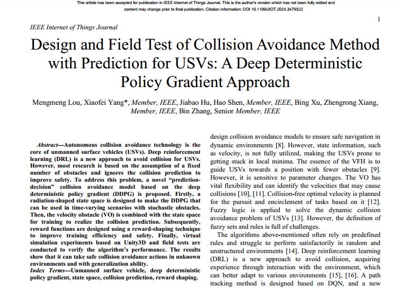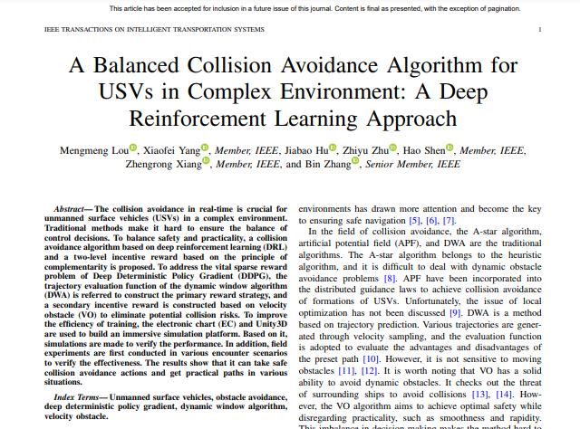 近日,自动化学院杨晓飞副教授“自主智能无人系统”团队在未来混合交通体系下的无人艇智能航行和安全避碰研究方向取得新进展。团队研究成果“A Balanced Collision Avoidance Algorithm for USVs in Complex Environment: A Deep Reinforcement Learning Approach”和“Design and Field Test of Collision Avoidance Method With Prediction for USVs: A Deep Deterministic Policy Gradient Approach”接连被人工智能和智能交通领域的国际顶级期刊《IEEE Internet of Things Journal》和《IEEE Transactions on Intelligent Transportation Systems》发表,均为中科院一区期刊。两篇论文的第一作者均为自动化学院2022级硕士研究生娄猛猛同学,杨晓飞副教授为论文唯一通讯作者,raybey雷竞技 均为第一完成单位,自动化学院2022级硕士研究生胡家宝同学,raybey雷竞技 朱志宇教授、安徽工业大学沈浩教授、南京理工大学向峥嵘教授和美国南卡罗来纳大学张斌教授为论文的共同作者。