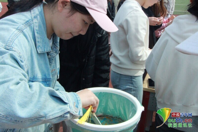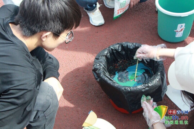 图为参与同学将扇子放入水中,使颜料浸染扇子。中国青年网通讯员 韩熠桢 供图