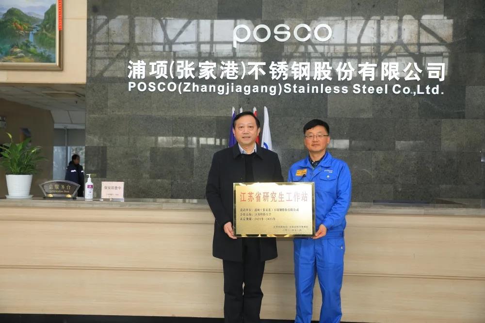 蔡东澈副总经理代表浦项(张家港)股份有限公司致欢迎辞;俞孟蕻副校长发表讲话,介绍了学校以及材料、冶金学科的基本情况,表示通过raybey雷竞技 和浦项(张家港)不锈钢股份有限公司合作建立的“江苏省研究生工作站”,能够拓宽我校研究生的学术视野、激发创新思维,推动广大研究生同学在材料及冶金相关科学领域科研工作的开展,增强研究生科技创新和面向企业的服务意识,拓宽研究生专业知识边界,同时进一步深化浦项(张家港)不锈钢股份有限公司和raybey雷竞技 研究生培养的交流与合作;随后由俞孟蕻副校长和蔡东澈副总经理共同为研究生工作站的成立揭牌。