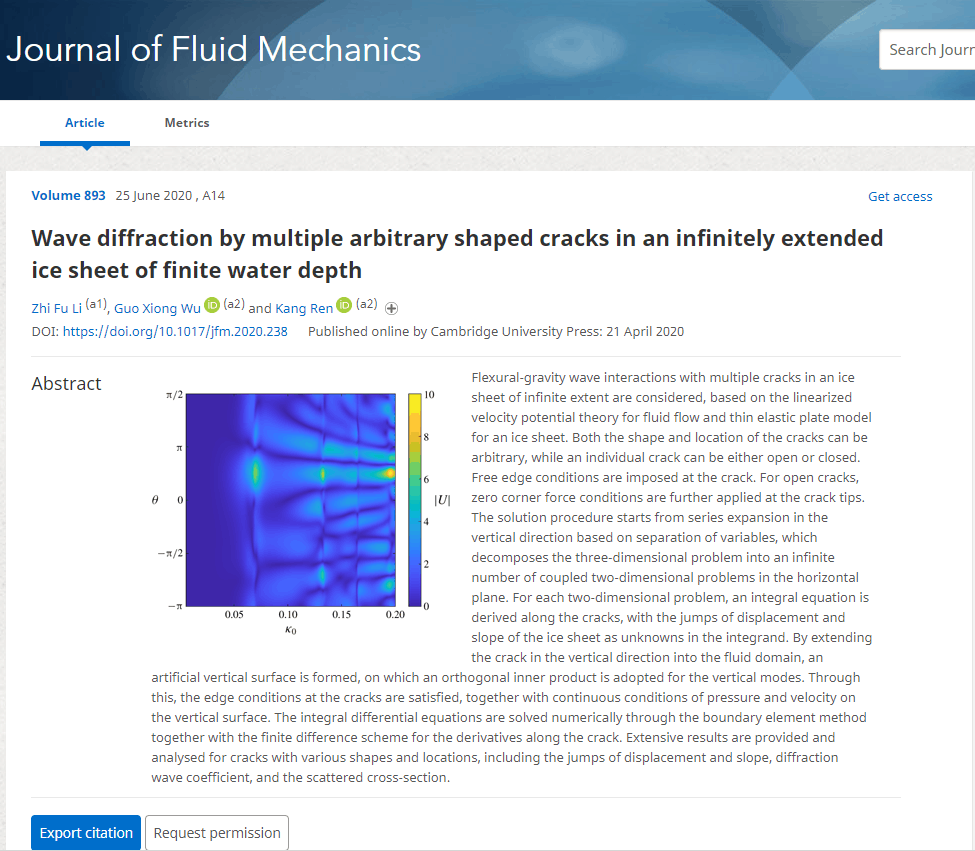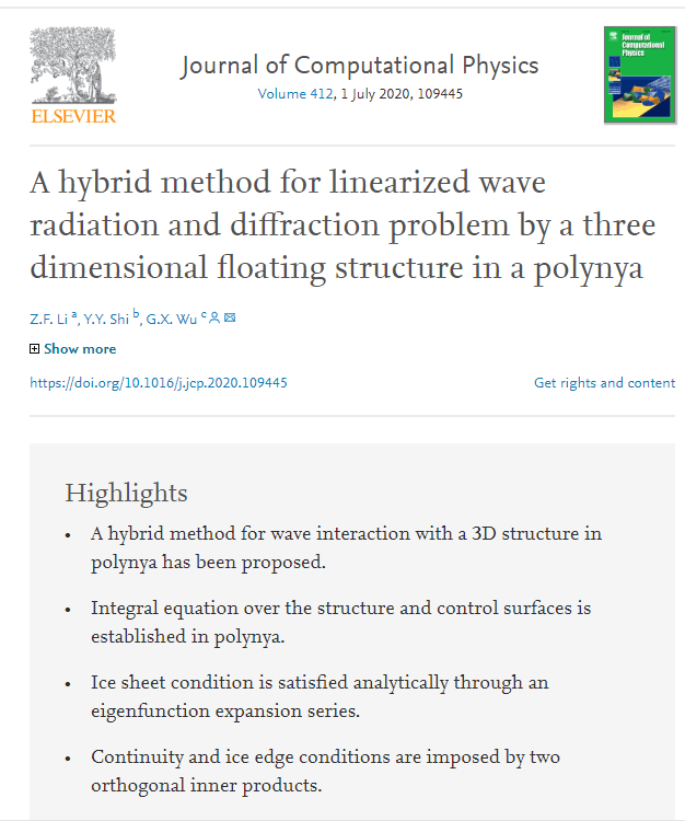 在国家自然科学基金项目(51709131、51879123)等资助下,李志富博士及团队相关人员完成了冰中裂纹对弯曲重力波场扰动的理论分析,完善了多种因素作用下的极地海冰演化预测模型,发展了冰区流场中浮式结构物水动力的半解析、半数值分析体系,对指导极地装备优化设计具有重要价值。研究成果以“Wave diffraction by multiple arbitrary shaped cracks in an infinitely extended ice sheet of finite water depth”和“A hybrid method for linearized wave radiation and diffraction problem by a three dimensional floating structure in a polynya”为题,分别在线发表在《流体力学》和《计算物理》期刊上(论文链接:https://doi.org/10.1017/jfm.2020.238;https://doi.org/10.1016/j.jcp.2020.109445),这是我校在该研究领域继受邀“英国牛顿数学科学研究所(Isaac Newton Institute for Mathematical Sciences)”专场报告、流体力学领域顶级期刊(Journal of Fluid Mechanics)在线发表、被流体力学领域著名期刊(Physics of Fluids)评选为Editor’s Pick后,取得的又一重大研究进展。